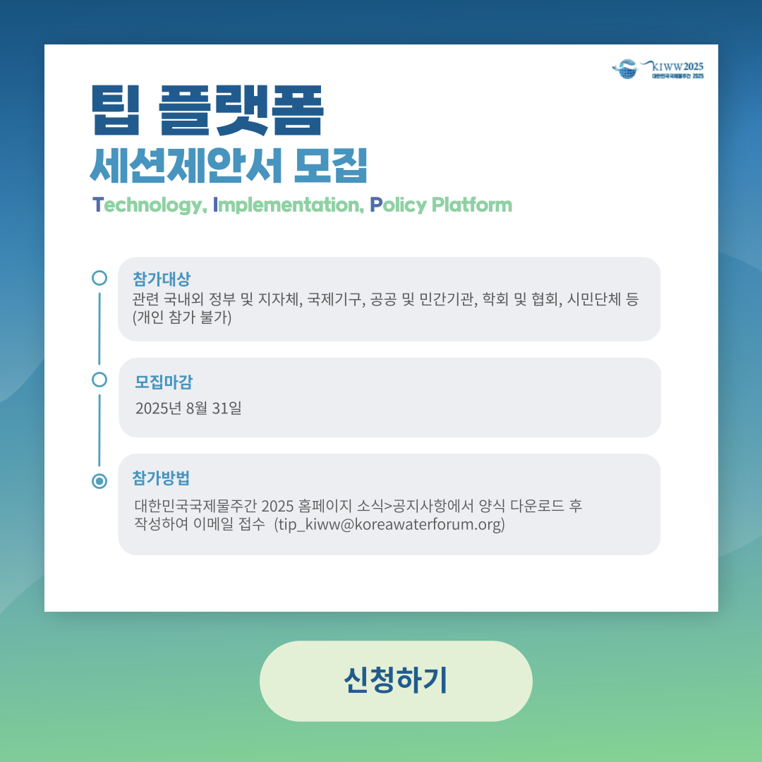 TIP 플랫폼(TIP: Technology, Implementation, Policy Platform)은 전 세계 물 문제 해결을 위한 적정기술 및 혁신 정책 기반 논의의 장으로, 정책 실행 경험과 사례를 공유하고 관련 이슈를 심도 있게 논의하는 플랫폼입니다. 발표, 패널토론, 라운드테이블, 토크쇼, 포스터 세션 등 다양한 형식으로 자유롭게 구성된 세션을 운영할 주관기관을 모집하오니 많은 관심과 참여 바랍니다.